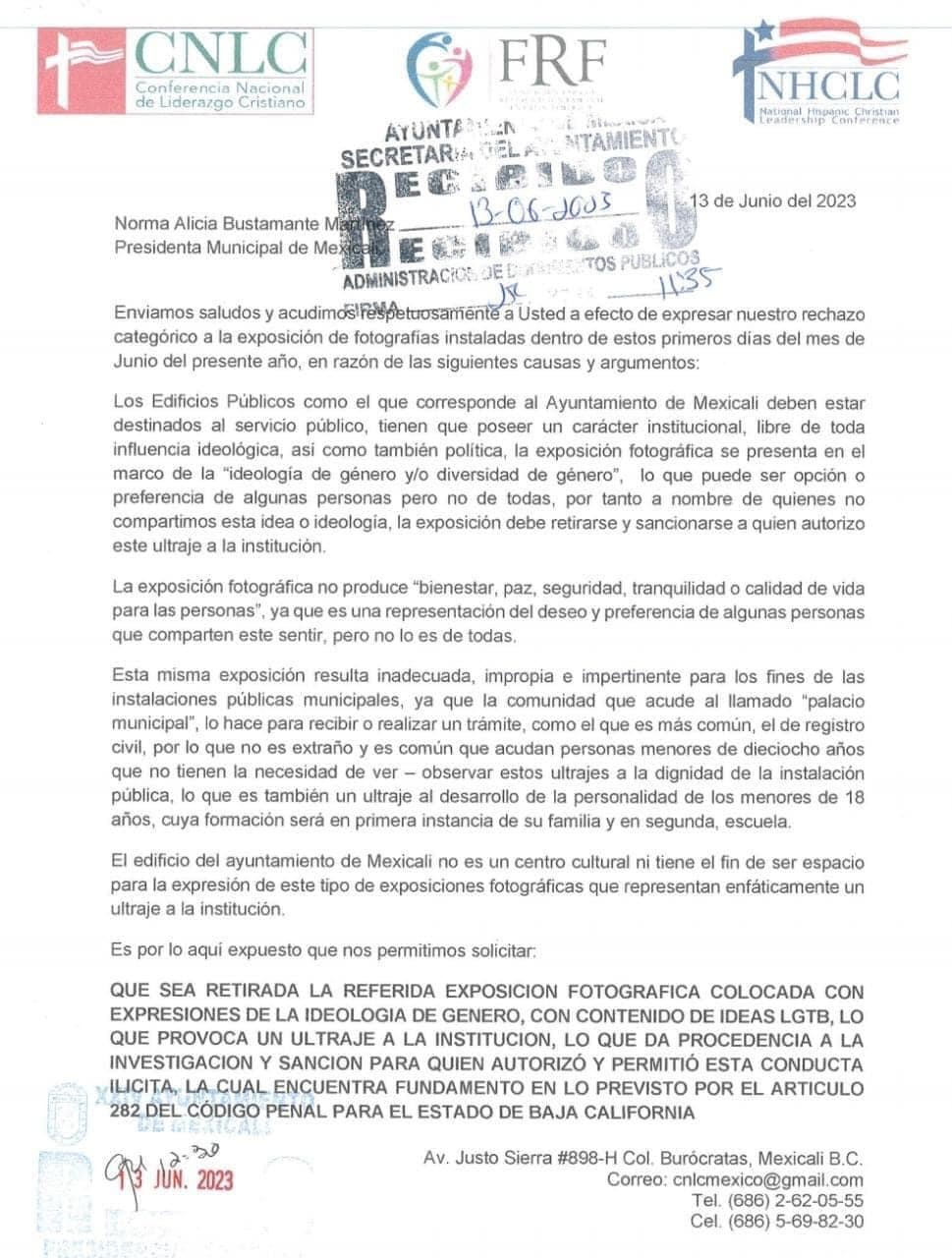 En su postura le piden a la presidenta municipal que sea retirada la referida exposición por expresiones de la ideología de género y contenido de ideas LGBT, esperando una pronta respuesta.