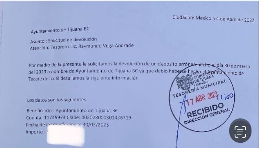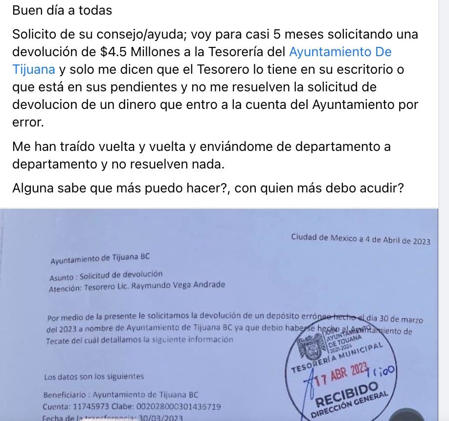 Una ciudadana pidió ayuda para resolver la devolución de 4 millones y medio de pesos, que, afirma, pagó por error al Ayuntamiento de Tijuana cuando su intención era depositarlos a las arcas del gobierno de Tecate hace cinco meses, y desde entonces no ha recibido solución.