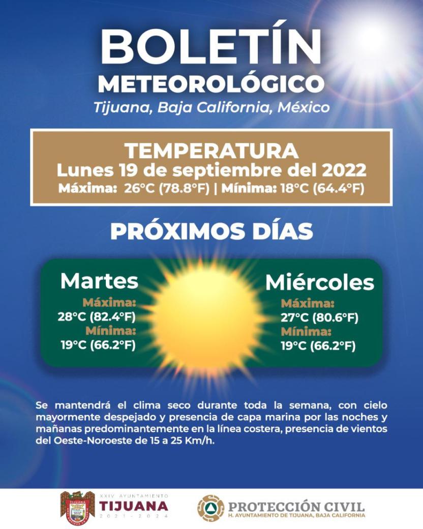 TIJUANA, 17 DE SEPTIEMBRE DE 2022.- El calor regresa a Tijuana tras un breve descanso con días frescos y lluvias, de acuerdo con The Weather Channel y Protección Civil municipal que anuncian que para mañana martes y el miércoles regresará el calor a la zona.