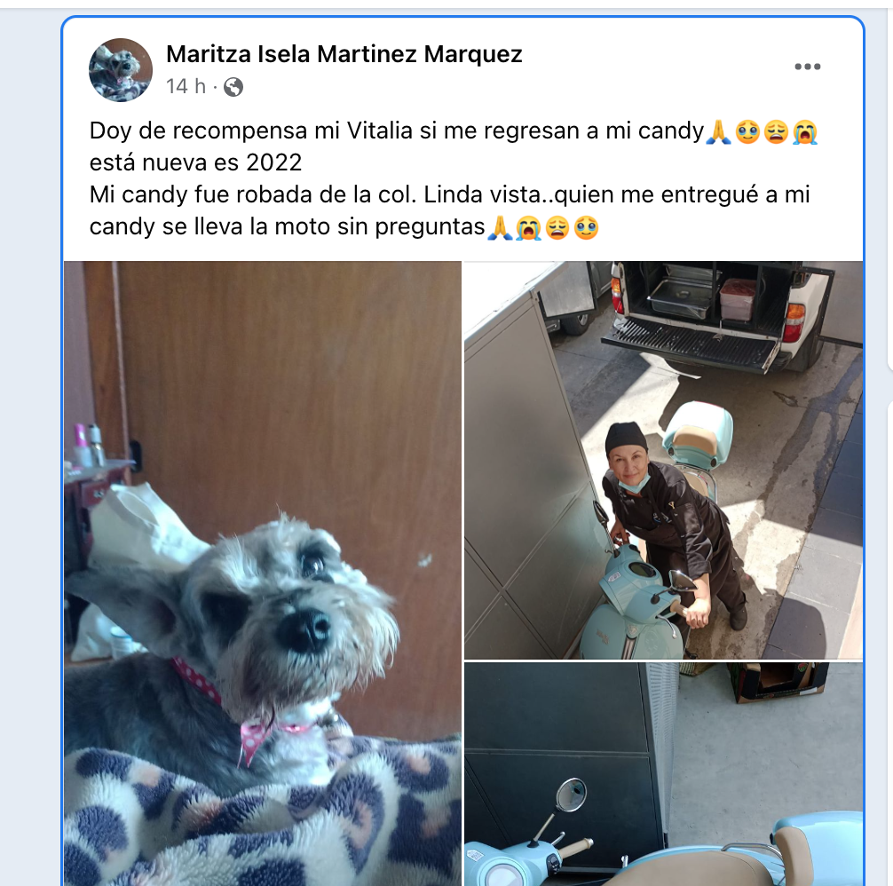 Una integrante del grupo de Facebook Perritos Perdidos Tijuana anunció que está dispuesta a cambiar su motocicleta modelo Vitalia 2022 a cambio de su mascota Candy, la cual según señaló, fue robada de su domicilio en la colonia Linda Vista.