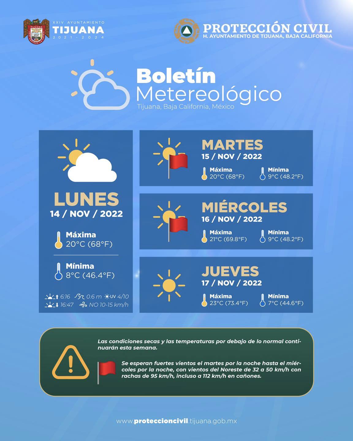 Este lunes Tijuana tendrá cielos semi nublados, con temperaturas de 21 grados como máximas y 8 como mínimas. El martes por la noche la temperatura disminuirá y habrá vientos de entre 32 y 50 kilómetros por hora, advirtió Protección Civil.