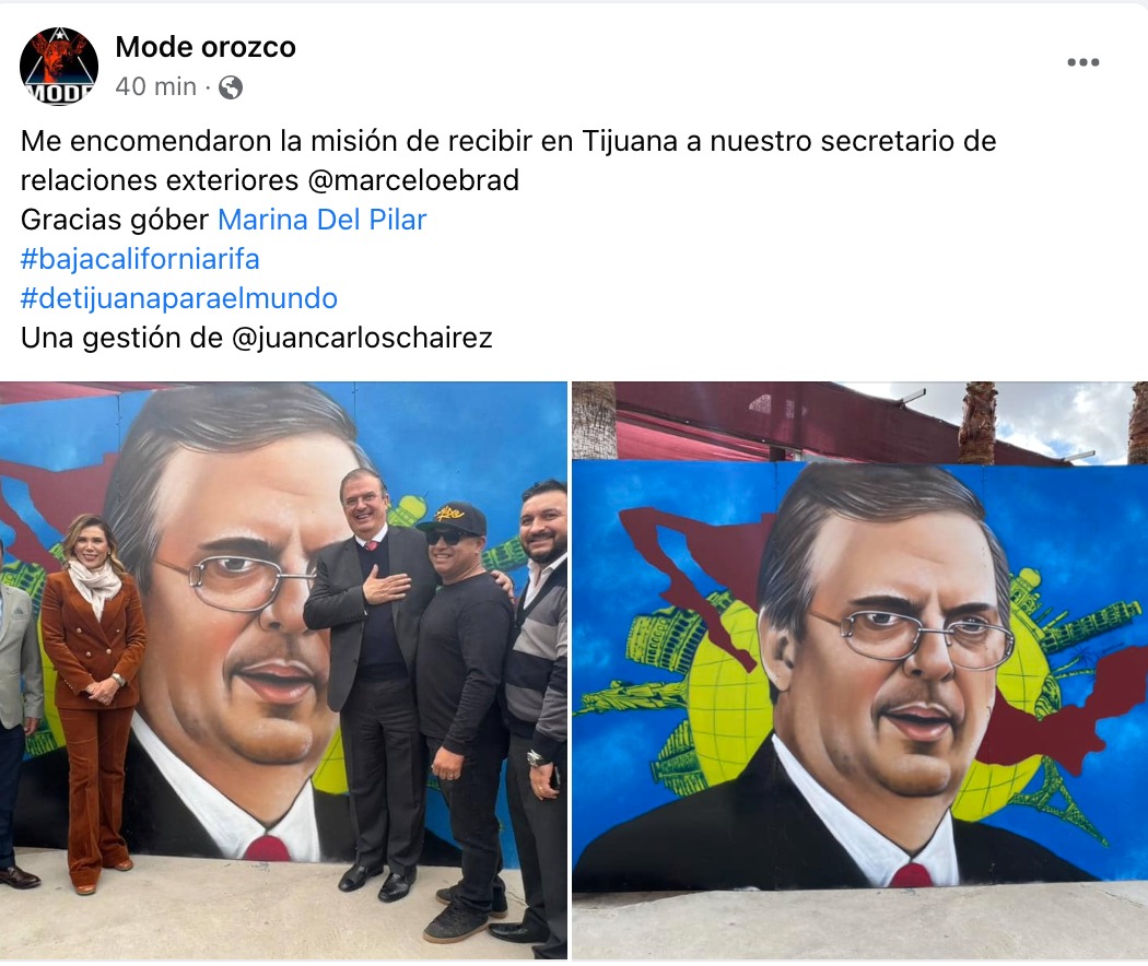 El canciller Marcelo Ebrard fue sorprendido por el muralista Mode con su retrato en una pared de la escuela Ceit en Tijuana, donde el funcionario acudió este día para inaugurar una nueva Sala de Juicios Orales.