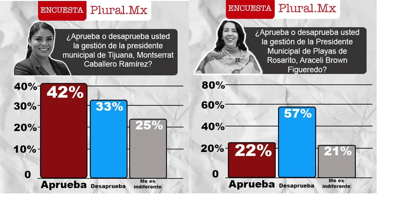 Una encuesta realizada entre el 3 y 6 de marzo por la encuestadora Plural.Mx, colocó a las alcaldesas y alcaldes de Baja California en un ranking encabezado por la presidenta municipal de Tijuana, Montserrat Caballero con un 42 por ciento de aprobación, mientras que Araceli Brown, de Rosarito, tuvo un 22 por ciento de aprobación y 57 por ciento de desaprobación.