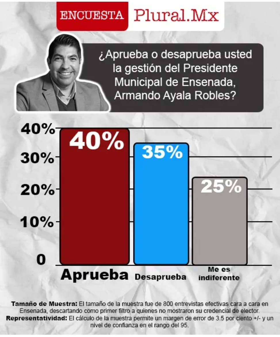 En segundo lugar, se posicionó Armando Ayala, presidente de Ensenada, con un nivel de aprobación del 40 por ciento; seguido por Norma Bustamante Martínez de Mexicali con el 38 por ciento y Darío Benítez Ruiz de Tecate con el 24 por ciento.