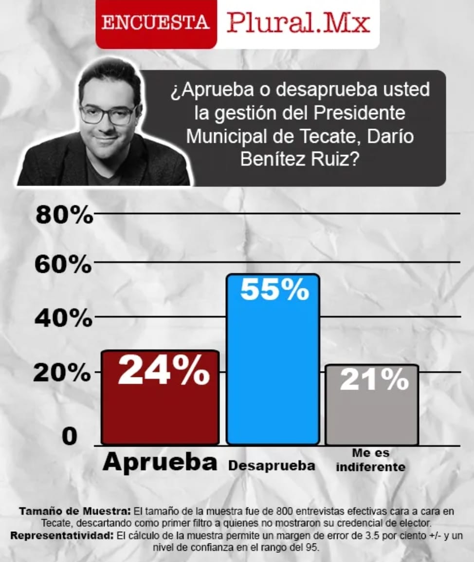 Darío Benítez tuvo un 55 por ciento de desaprobación, cercano a Araceli Brown, quien fue reprobada por el 57 por ciento de los rosaritenses, de acuerdo con los números de Plural.Mx.