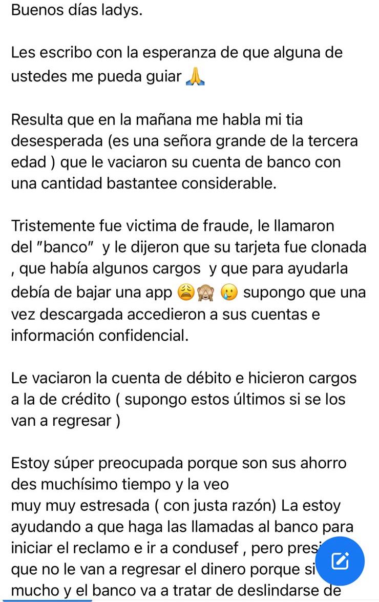 Al parecer a la señora le hicieron una llamada del ”banco” y le dijeron que su tarjeta había sido clonada y que presentaba cargos no reconocidos.