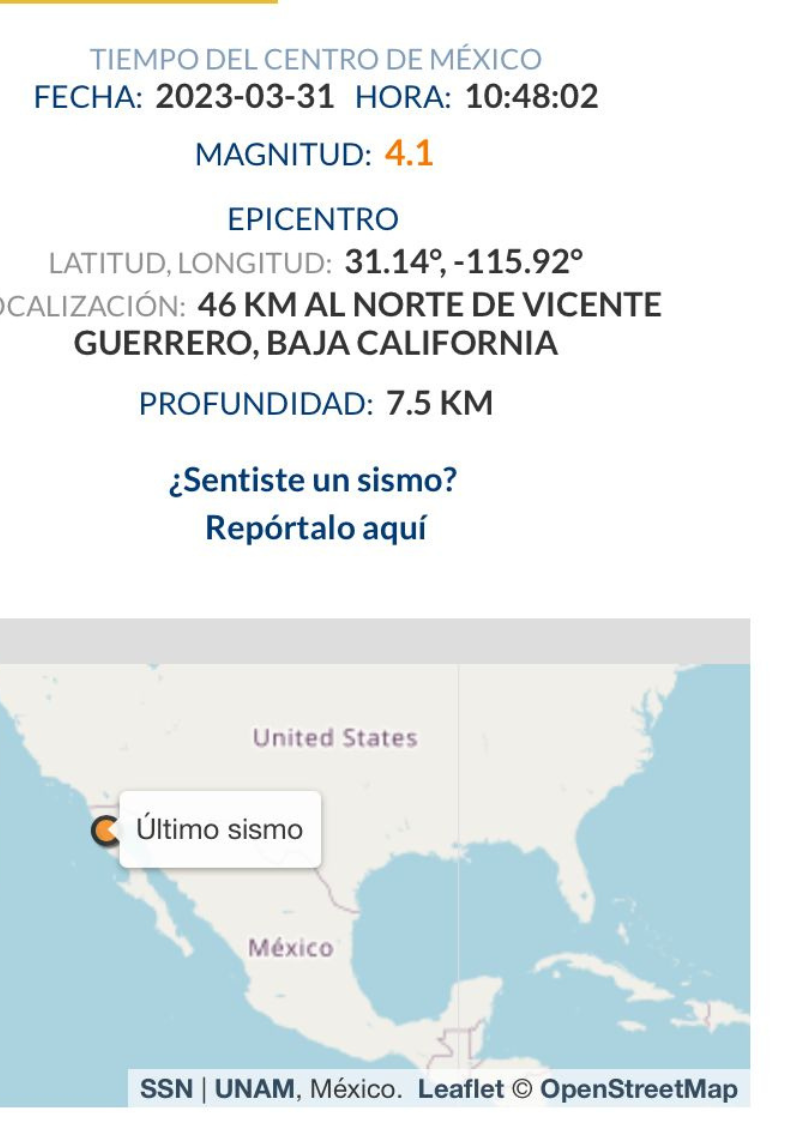 De la misma manera, esta mañana se registró en Vicente Guerrero, Baja California un sismo de magnitud 4,1, con una profundidad de 7.5 km.