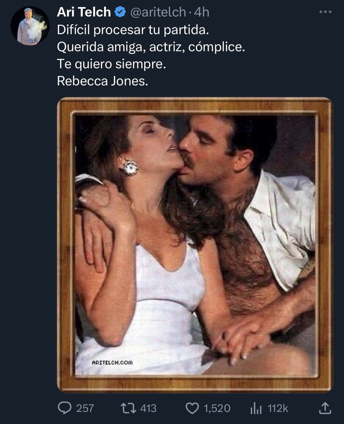 El Telch escribió e “Difícil procesar tu partida. Querida amiga, actriz, cómplice. Te quiero siempre. Rebecca Jones”, mismo que acompañó con una fotografía en donde aparece junto Rebecca Jones mientras le da un sensual beso en la barbilla.