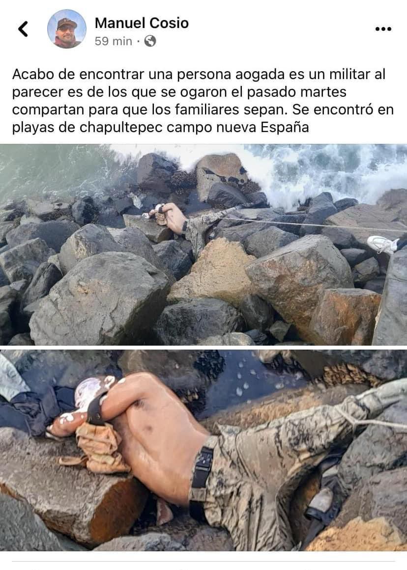 “Acabo de encontrar una persona ahogada, es un militar al parecer es de los que se ahogaron el pasado martes. Compartan para que los familiares sepan. Se encontró en playas de Chapultepec campo nueva España”, señala la publicación compartida por cientos de usuarios esta mañana.